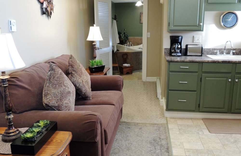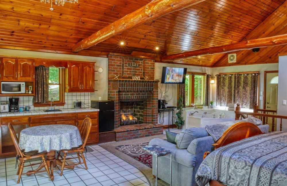 Romance your loved one in Amish Country's exclusive Romancing the Stone Cabin, where every moment offers secluded privacy for two. On the first level, a luxurious Jacuzzi room brings the pleasure of the outdoors in, with water cascading over a huge natural rock, and moss, ferns and ambient lighting artfully placed to accentuate the waterfall. Tucked into an arched log window alcove and facing the waterfall is a heart-shaped Jacuzzi, providing couples celebrating their honeymoon, anniversary or other special occasion with the opportunity to let love flow.