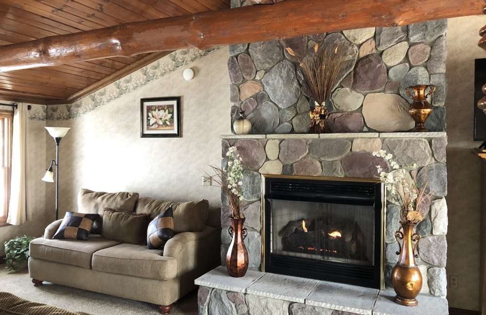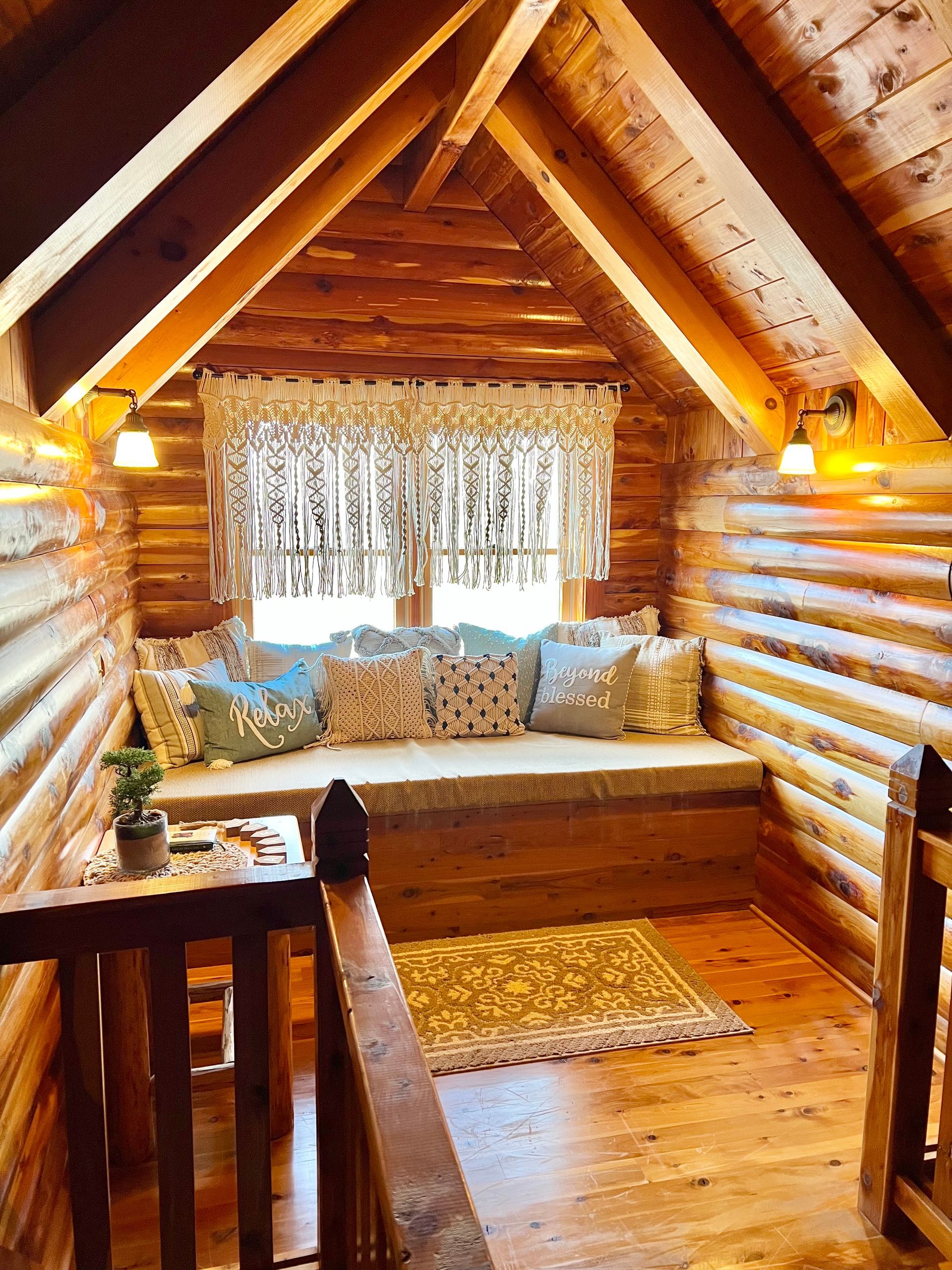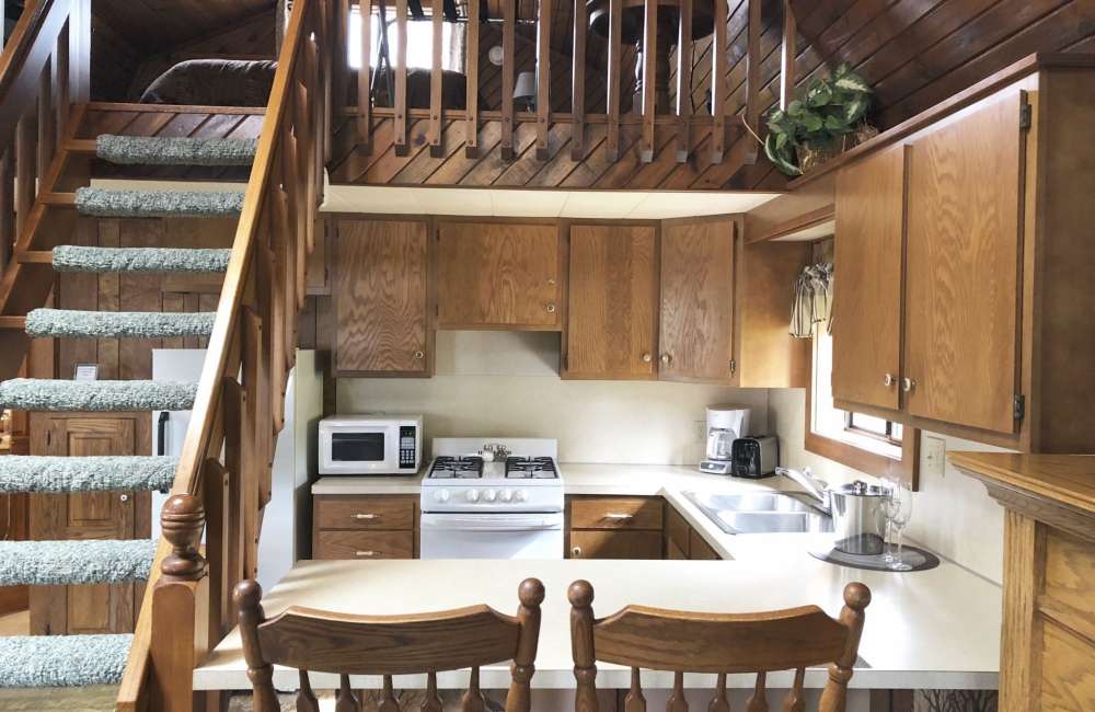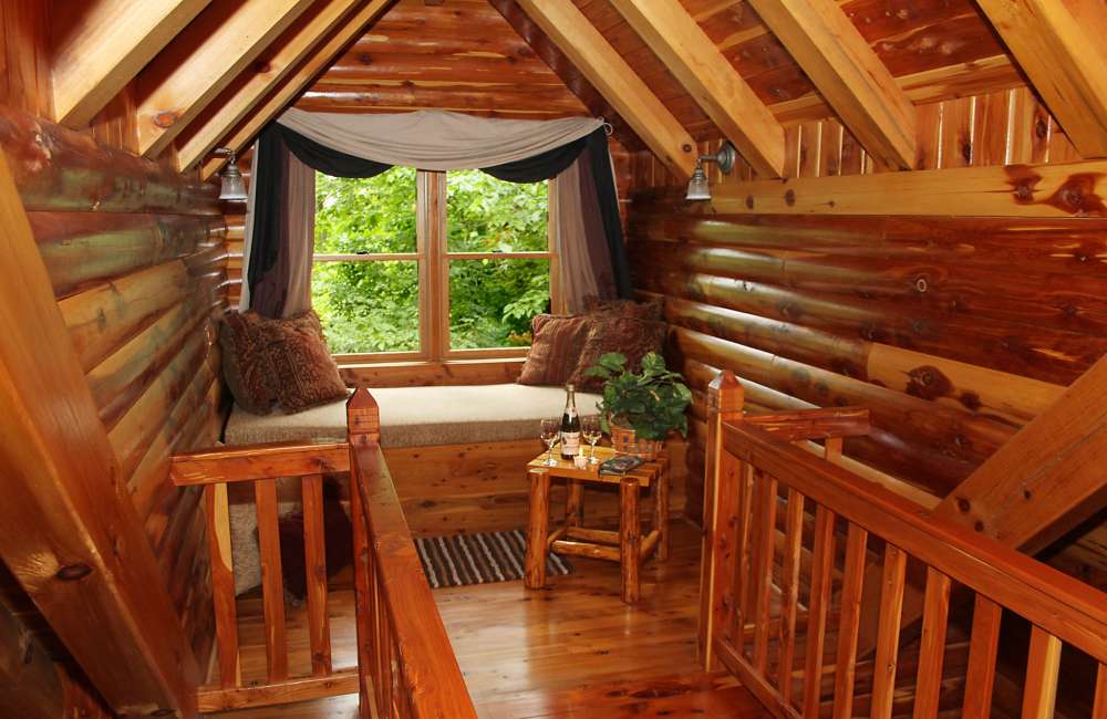 The distinctive lofted bedroom features a king-size log bed and a cedar walkway leading to a dormer window alcove that boasts an impressive view of the woods. Cuddle on the deep pillow window seat, together. This romantic cabin getaway in Northeast Ohio offers the perfect setting to experience with that special someone.