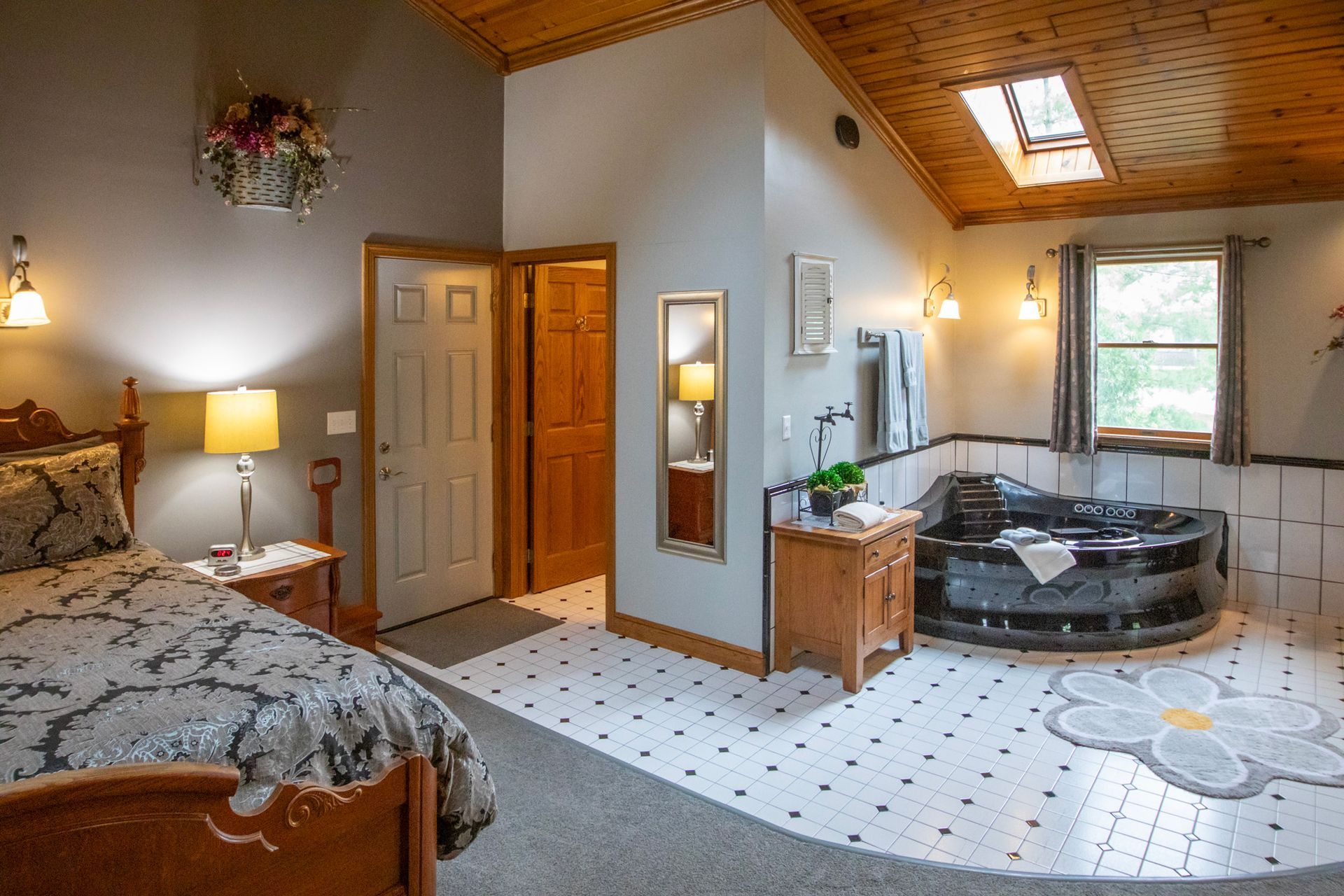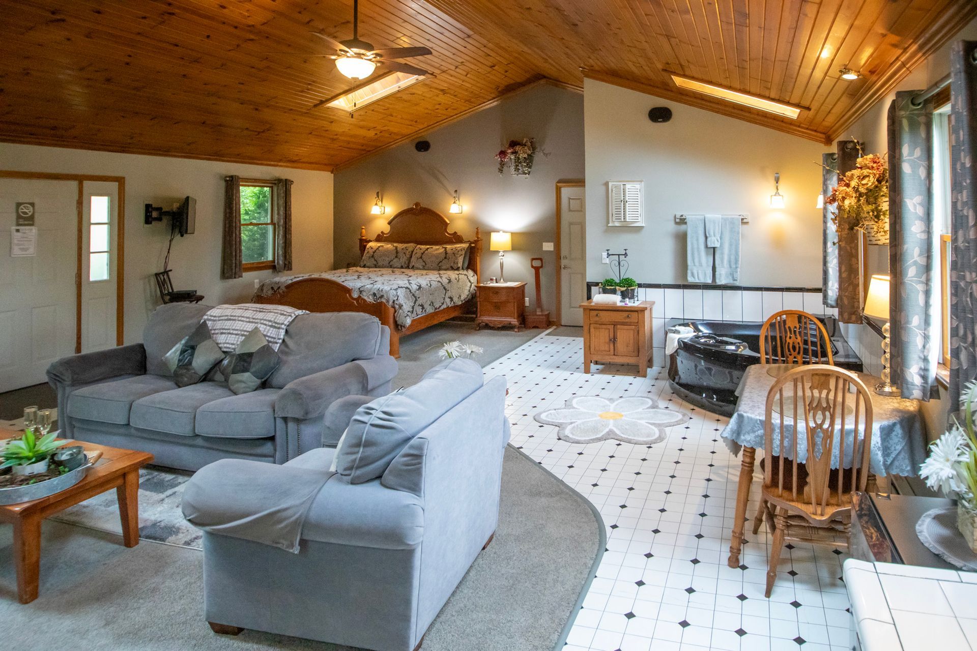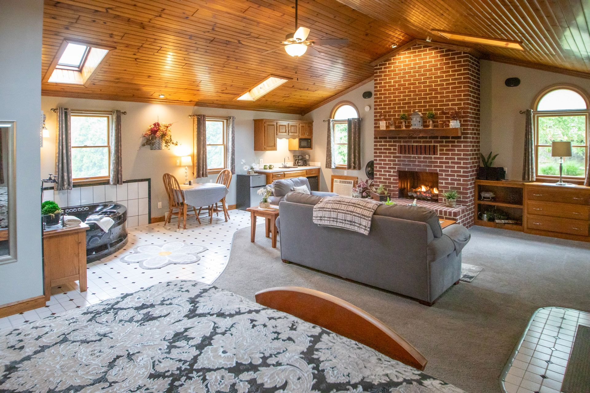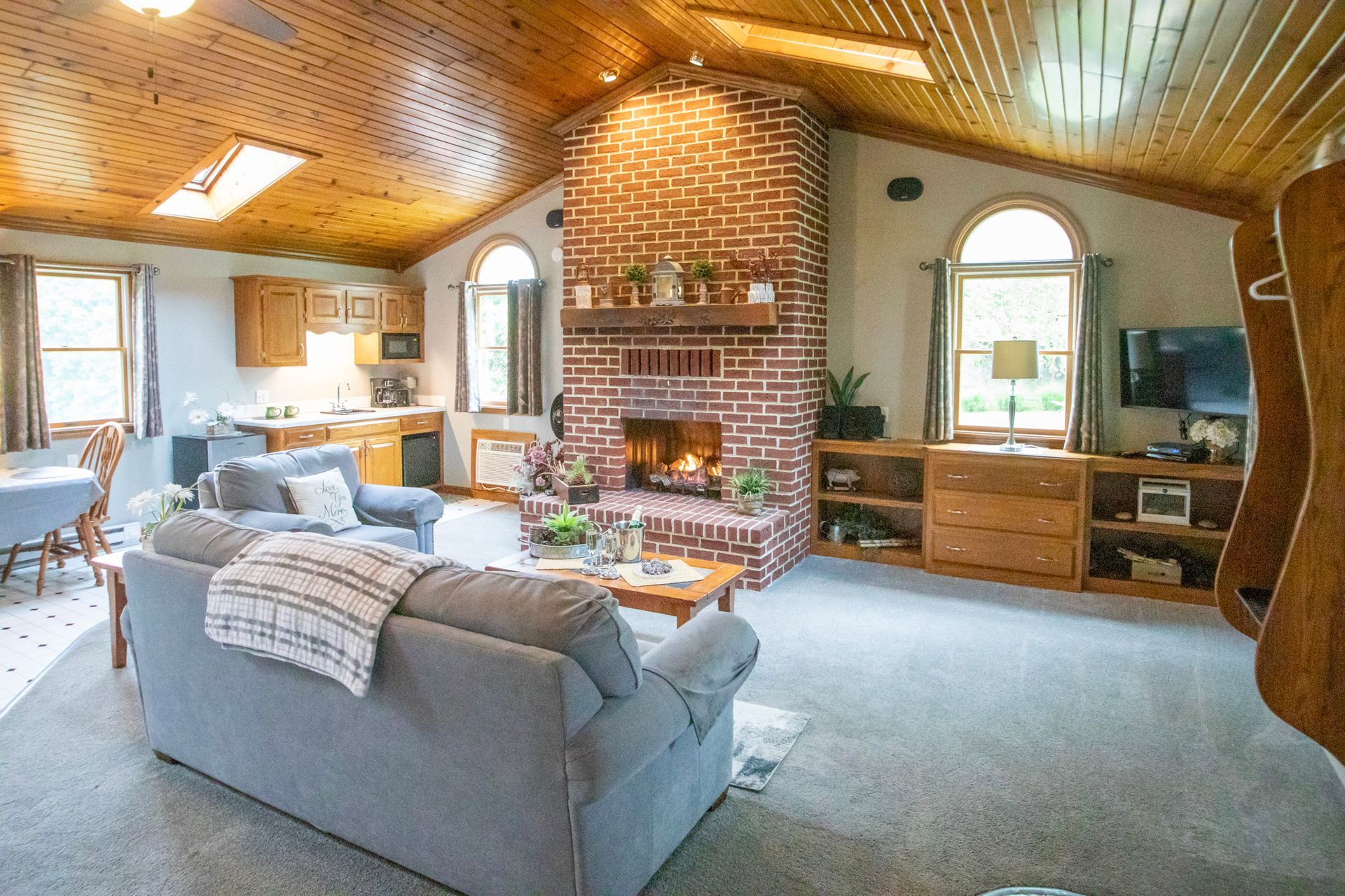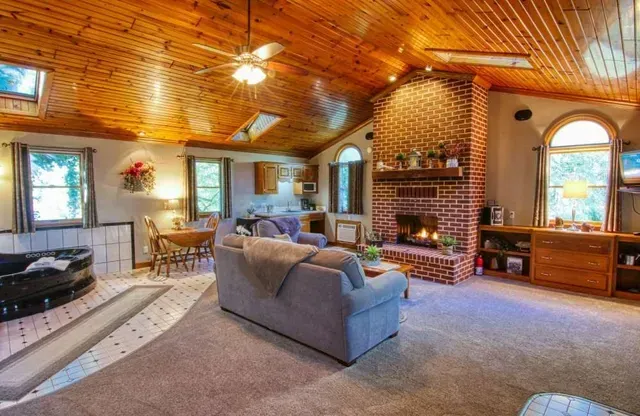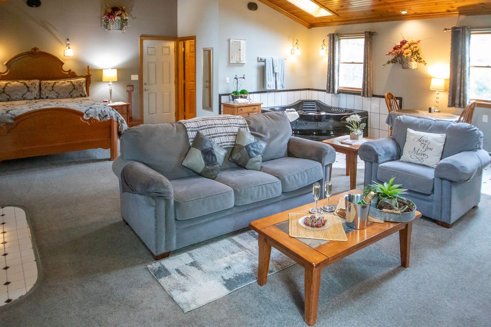 Inside, vaulted wooden ceilings and skylight windows fill the space with warmth and natural light, creating an inviting, airy atmosphere. Soak together in the heart-shaped waterfall Jacuzzi or unwind by the warm, flickering fireplace—designed to spark romance and create unforgettable moments.