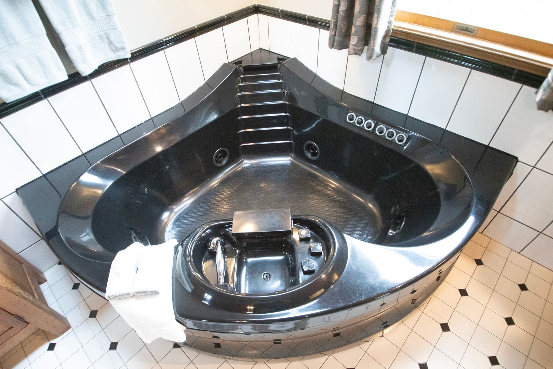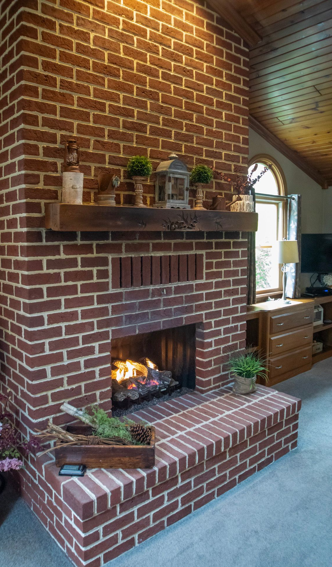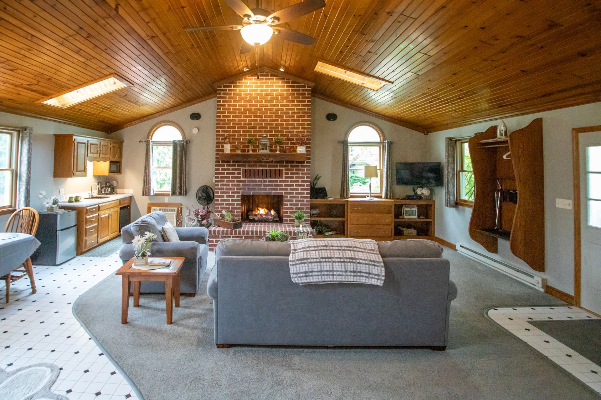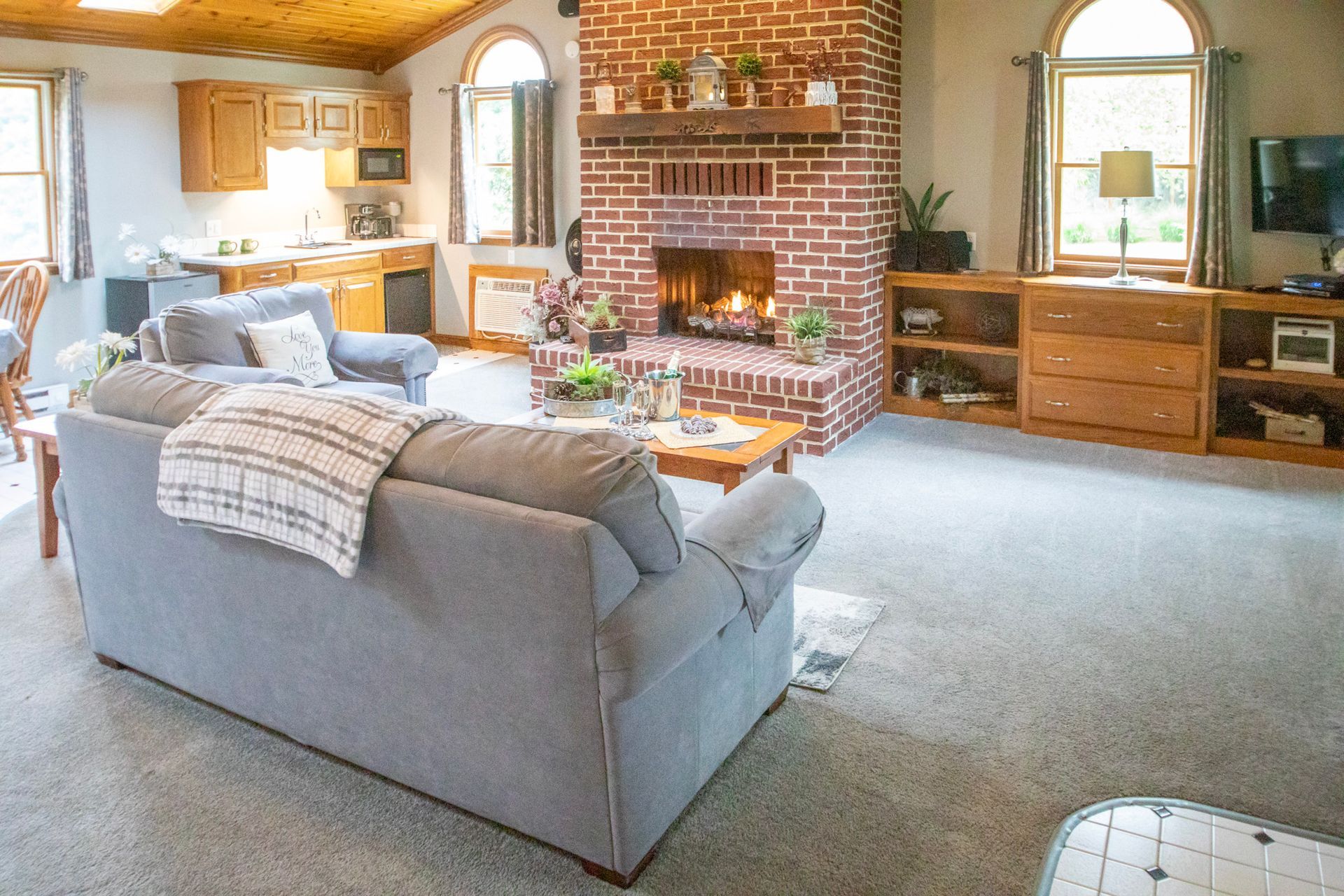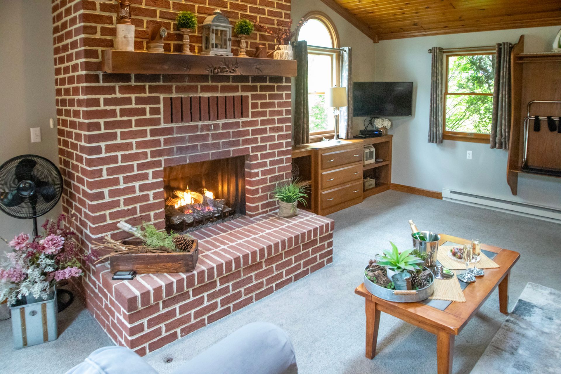Inside, vaulted wooden ceilings and skylight windows fill the space with warmth and natural light, creating an inviting, airy atmosphere. Soak together in the heart-shaped waterfall Jacuzzi or unwind by the warm, flickering fireplace—designed to spark romance and create unforgettable moments.