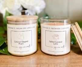 These locally hand-poured candles come in a beautiful glass jar with a bamboo lid and are 14 ounces each. Scents included are Salted Caramel Latte and Caramel Dipped Pears.