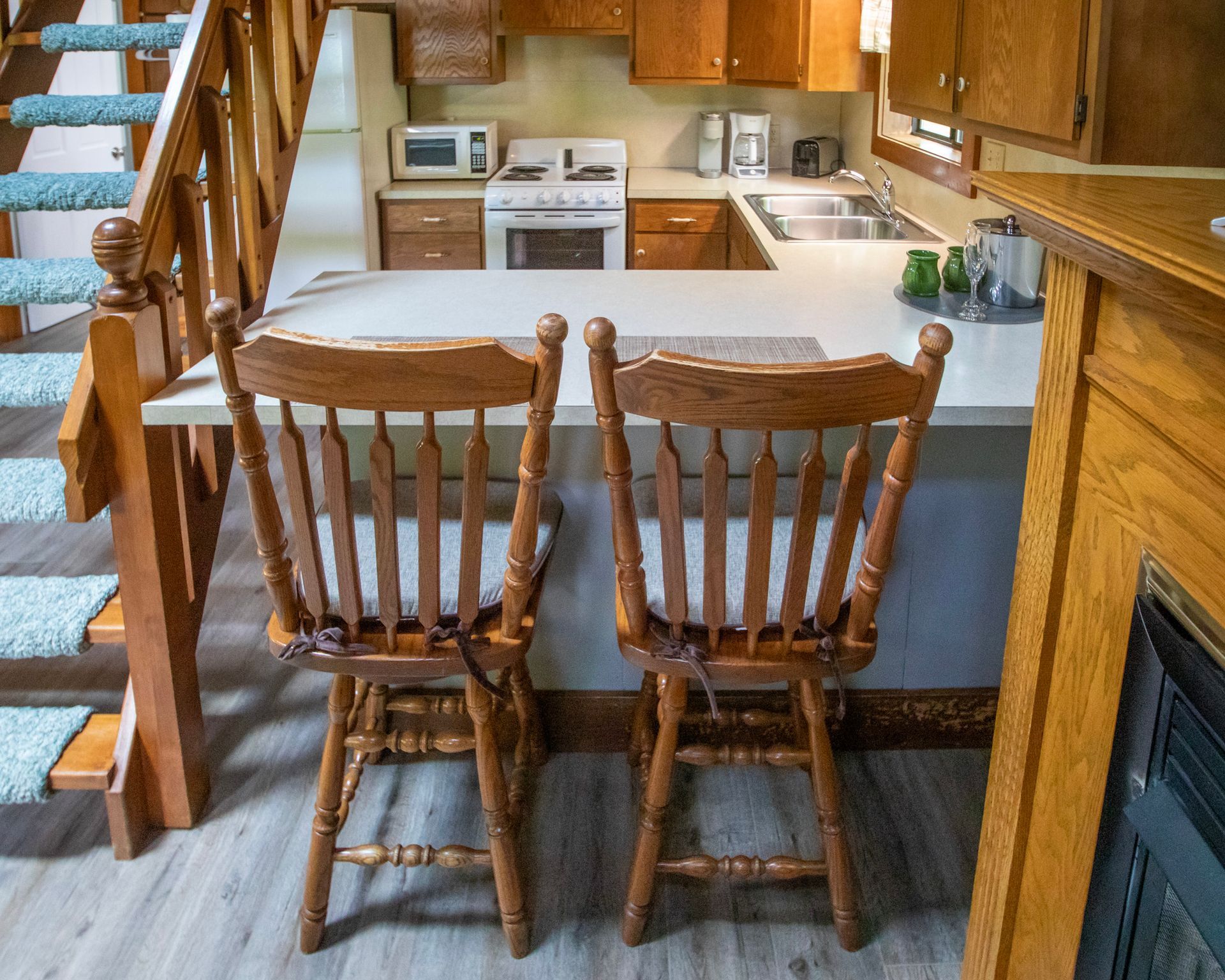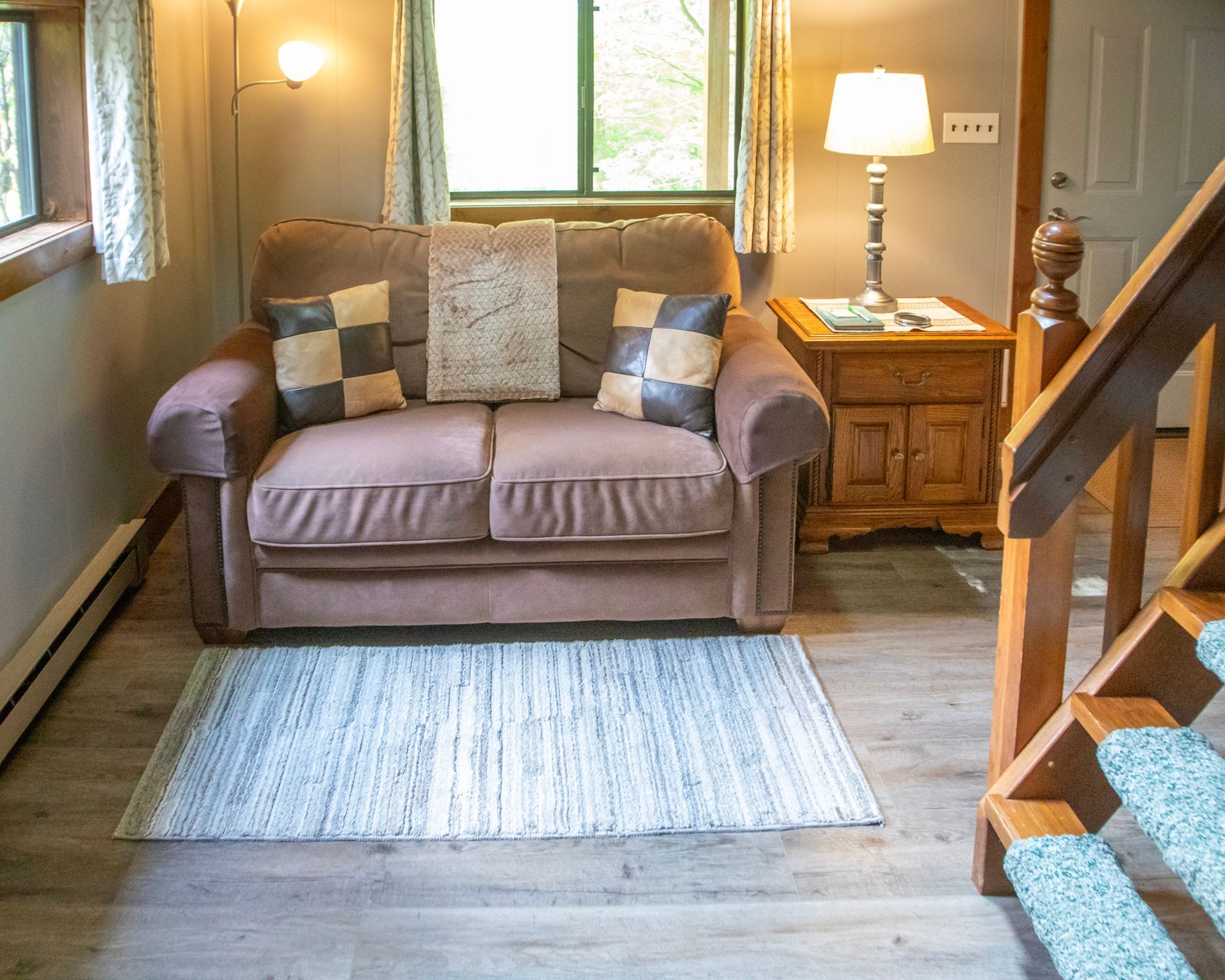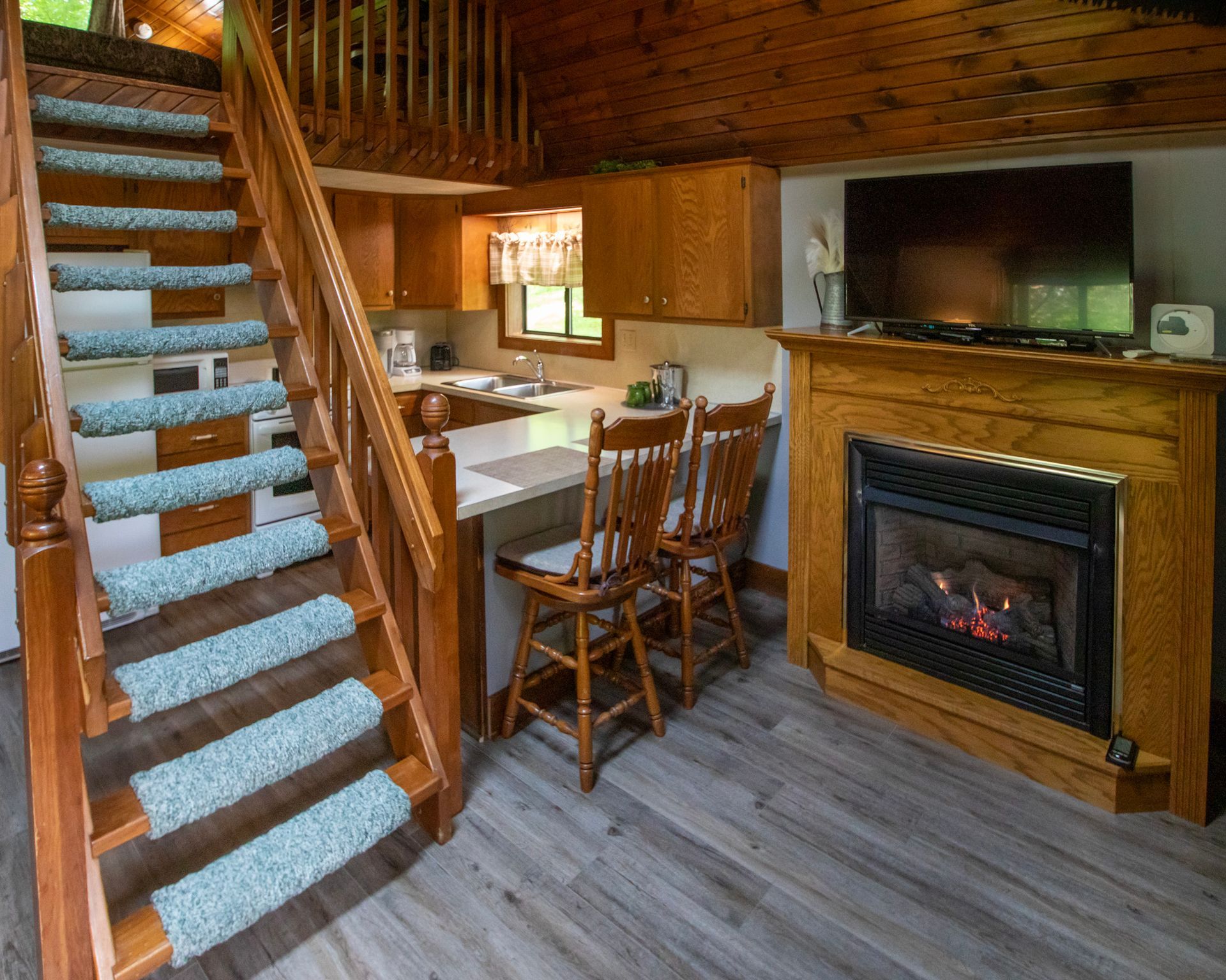 The Donna’s Premier Lodging Original Log Cabin holds a special place in the hearts of returning guests. As the very first rustic retreat on our lush, wooded grounds, its timeless charm continues to enchant all who visit. A winding paved driveway leads to one of Amish Country’s most beloved log cabin rentals—a serene escape where stress melts away and carefree relaxation takes over. Hickory rockers on the front porch complete this idyllic, nature-lover’s paradise.
