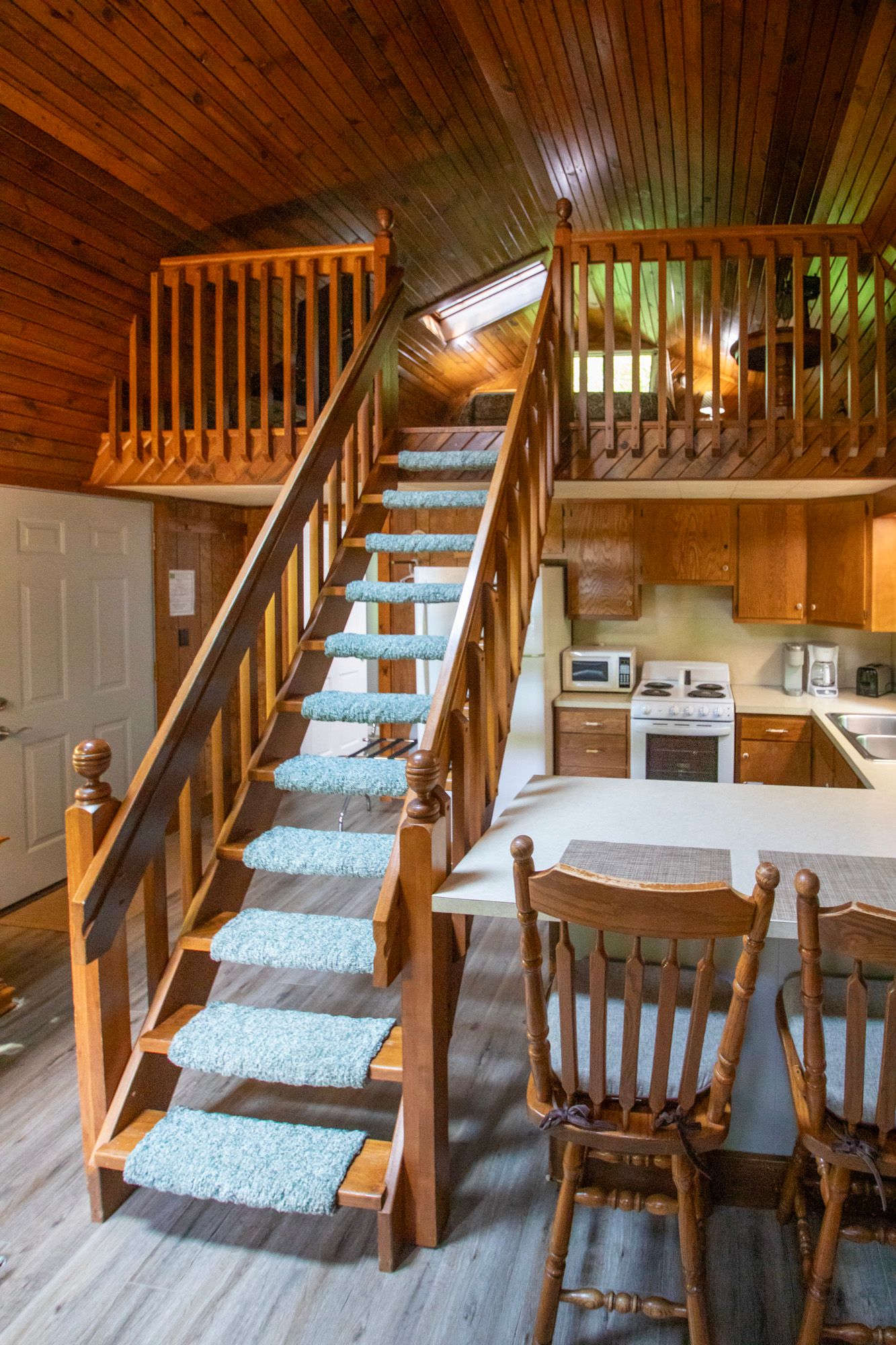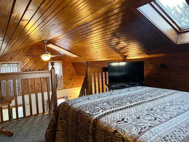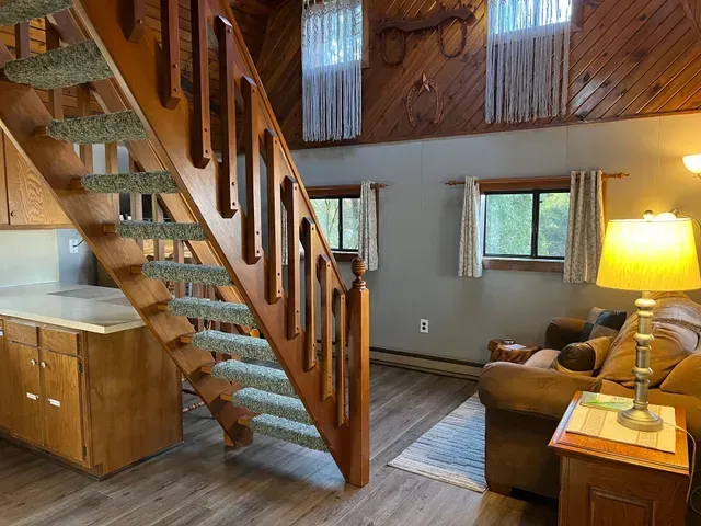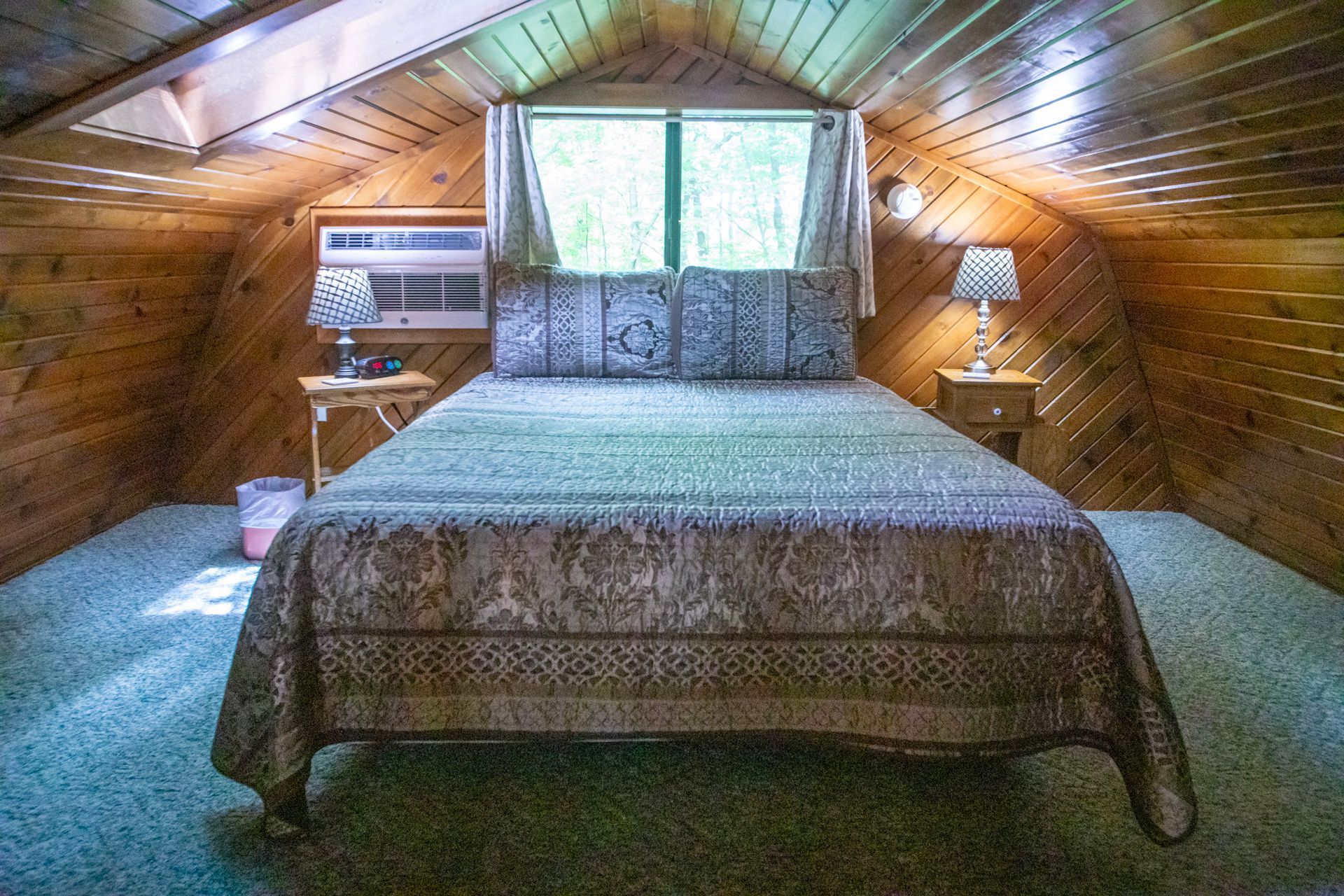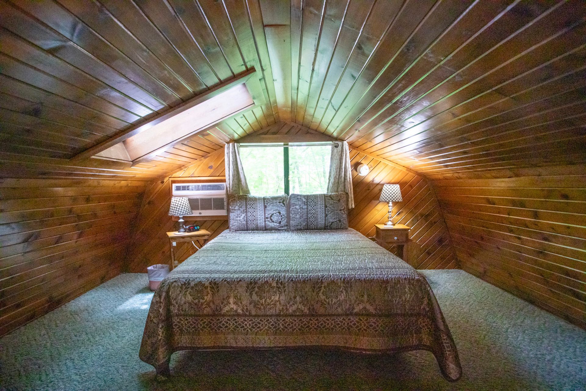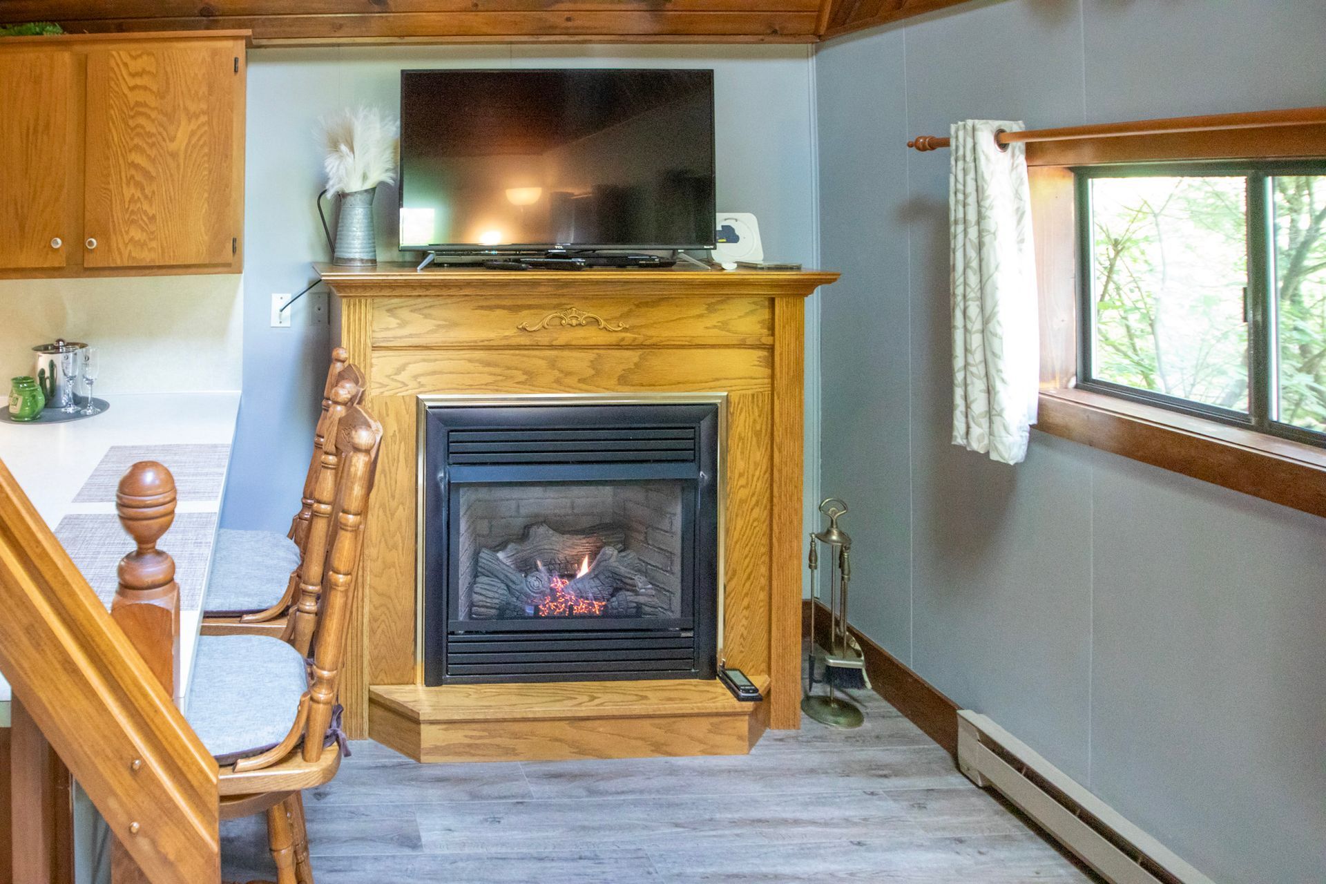 Inside, the Original Log Cabin offers a Jacuzzi for two and a cozy fireplace, perfect for a romantic retreat. The lofted bedroom, featuring a queen-size bed, skylight, and cable TV, provides a peaceful spot to gaze at the stars and unwind. This charming cabin invites you to savor every moment—so be sure to allow yourself the luxury of sleeping in during your stay.