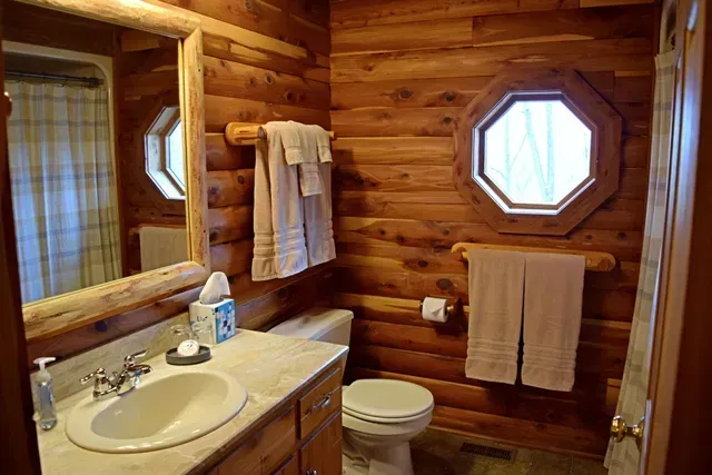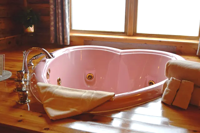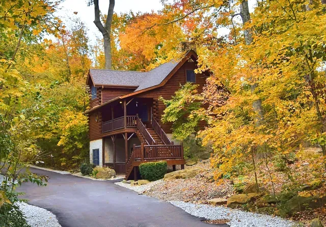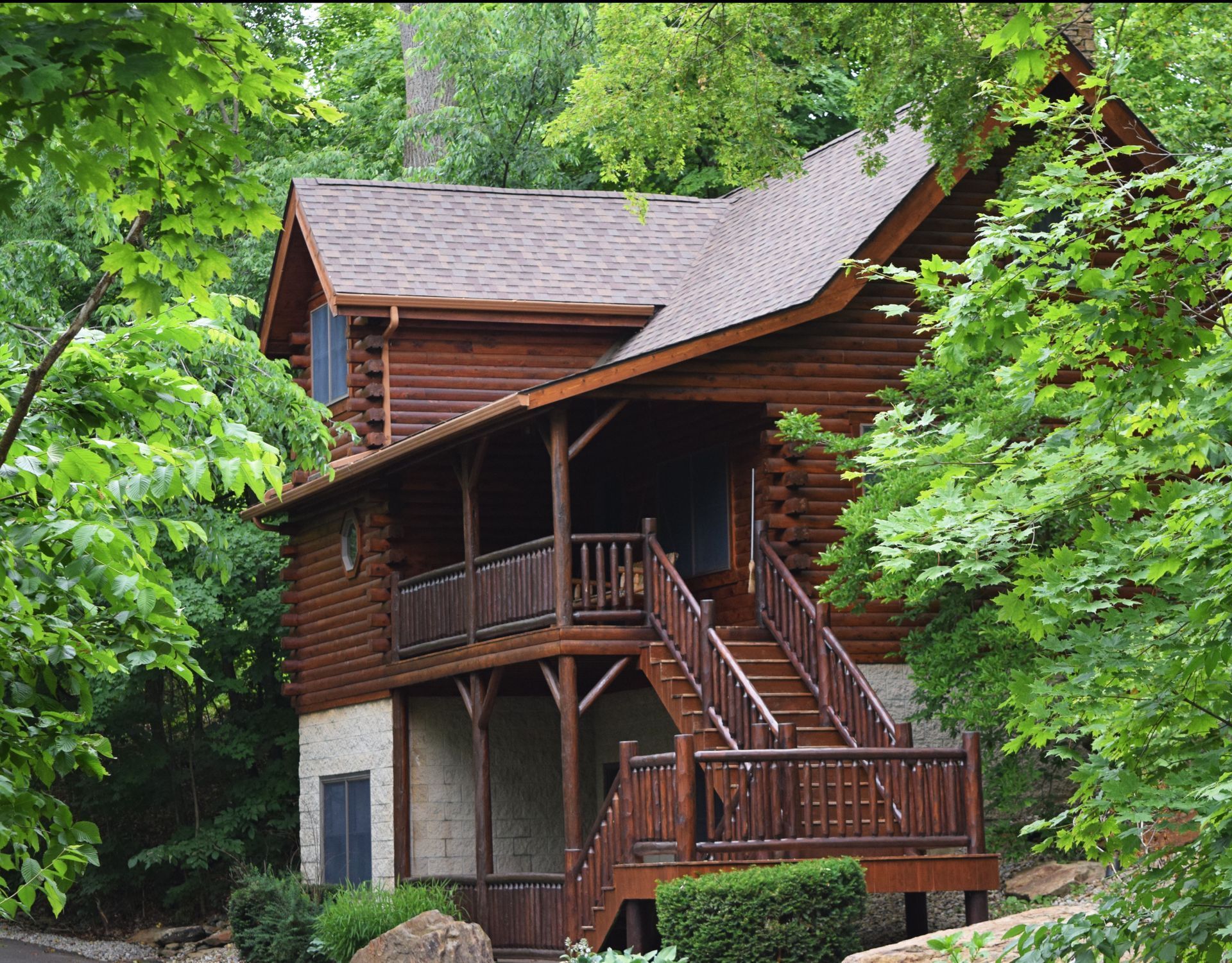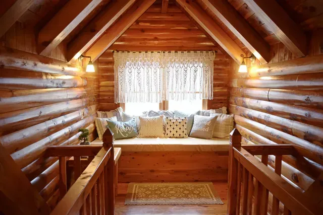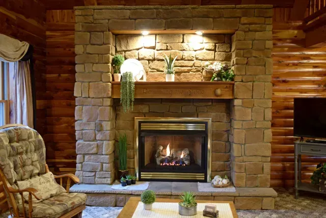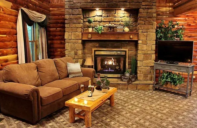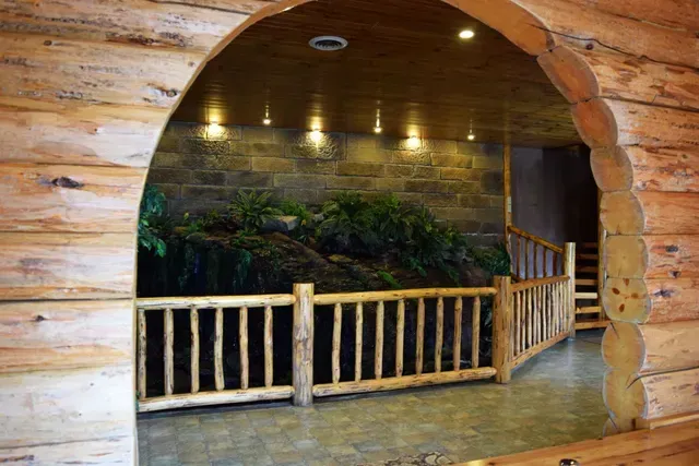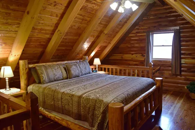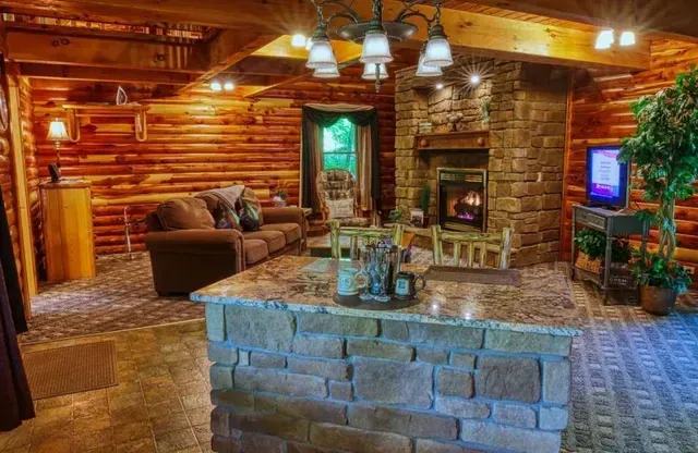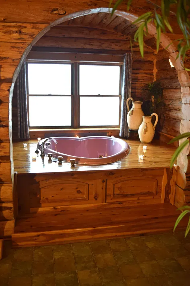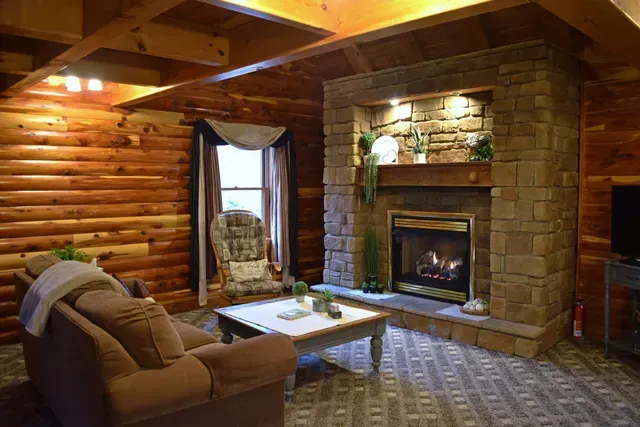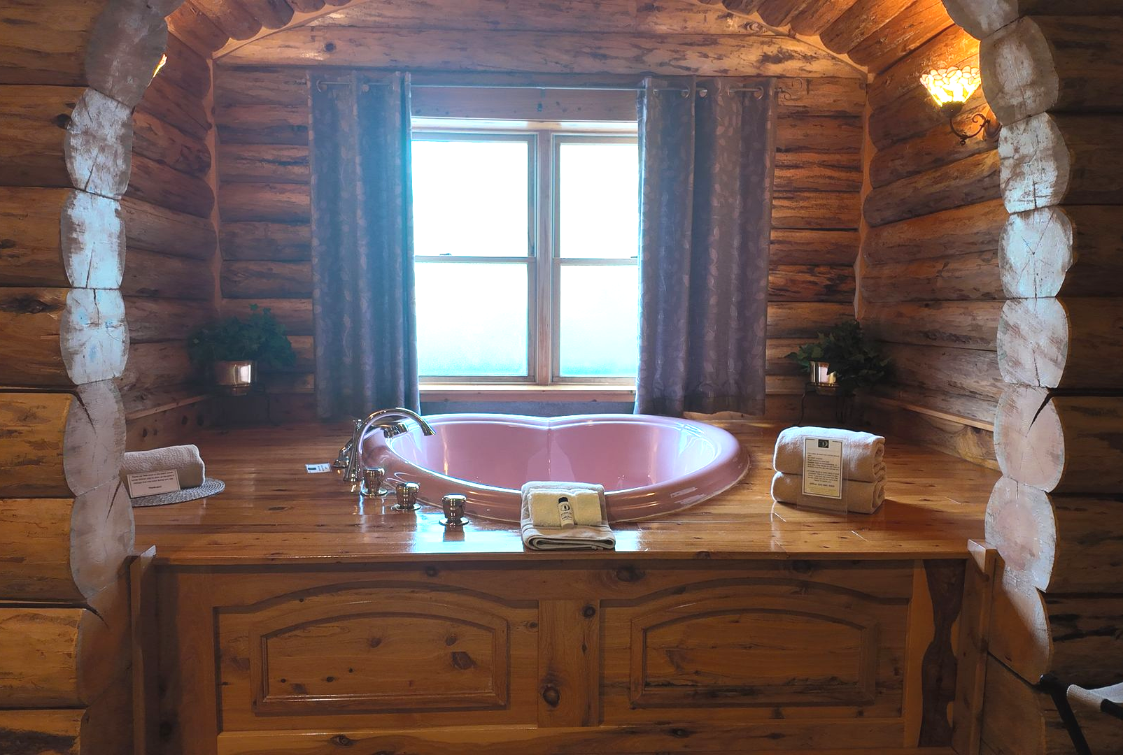 Celebrate romance in Amish Country’s exclusive Romancing the Stone Cabin, where every moment is designed for private, intimate experiences for two. You won't find another accommodation like Romancing the Stone. On the first level, a luxurious Jacuzzi room brings the outdoors in, with water cascading over a massive natural rock, surrounded by moss, ferns, and carefully placed ambient lighting that highlights the waterfall. Nestled in an arched log window alcove and facing the waterfall, the heart-shaped Jacuzzi invites couples celebrating a honeymoon, anniversary, or special occasion to let love flow freely.
