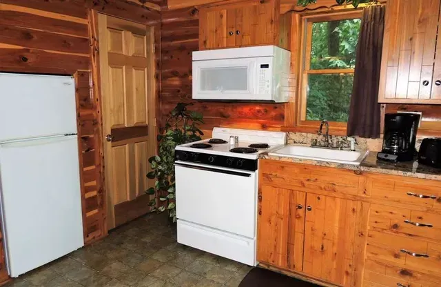 The second level of this Berlin, Ohio, romantic retreat features a spacious living area with a stunning stone fireplace, its hickory mantel engraved with “Romancing the Stone.” The full kitchen exudes luxury with a natural stone breakfast bar, imported Brazilian granite countertops, and Australian cypress cabinetry, creating an elegant and inviting space for cooking and gathering.